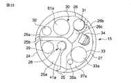 また、これら湾曲操作ワイヤ23は、基端部が操作部12(図1参照)内に設けられた図示しない湾曲操作機構に連結されている。操作部12には、湾曲操作機構を駆動する図示しない4方向湾曲操作用の湾曲操作ノブが配設されている。  Further, the
