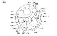 また、図4(A)に示すように先端部15の円柱部材15aに形成される第6の孔部15a6には基端部側から処置具挿通チャンネル33に連通する連通管105の先端部分が挿嵌されている。この連通管105の基端部は円柱部材15aの後方に突出され、この連通管105の基端部分に処置具挿通チャンネル33の先端部が連結されている。この処置具挿通チャンネル33の先端は、先端カバー24の先端開口部33aに連通されている。  As shown in FIG. 4A, the sixth hole 15a6 formed in the