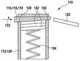 軸方向で異なる断面形状を有する類似構造の密封要素118を、図1および2に例示した実施形態と組み合わせる、つまりマガジン側に、たとえばエラストマのシールのような密封要素132を追加することもできる。この場合、密封摺動体つまり密封要素118は、先端部が小さい断面を有する。密封要素118がマガジン112に完全に、つまり大きい断面の後端部が挿入されて初めて、開口128、130は密閉される。  A similarly structured sealing
