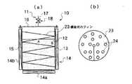 図2は本発明の実施の形態でない固体原料気化装置の参考例を示す図で、(a)は縦断面図、(b)は横断面図である。図2の参考例において、図1の参考例と同じ部分は同じ参照符号を付して説明を省略し、異なる部分について説明を加える。図2に示すように、前記原料容器13内には、熱伝導部材として、上下方向に螺旋状のフィン23が設けられている。螺旋状のフィン23は、原料容器13の内周壁(周側壁)に接していて、溶接により固定されている。螺旋状のフィン23には、複数の孔24が形成されていることが好ましい。以上の構成からなる固体原料気化装置10によれば、熱伝導部材として、原料容器13内に上下方向に螺旋状のフィン23が原料容器13の内周壁に接して設けられているため、原料容器13の周側部から螺旋状のフィン23への熱伝導により、原料容器13内の固体原料12を中央領域Aと周縁領域Bの間に温度勾配を生じさせずに十分に加熱することが可能となり、図1の参考例と同様の効果を奏することができる。
