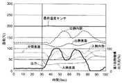 第1加熱機構56の出力および第2加熱機構57の出力をフィードバック制御によって決定するようにした場合、液体IPAの供給開始時から数十秒間、上流側のスパイラル部内における温度が上下変動を繰り返すようになる。ここで図3および図4は、液体IPAの供給時における、第1スパイラル部51の入側外表面温度、入側内部温度、中間外表面温度、出側外表面温度、出側内部温度(各位置は図1参照)、最終温度センサ測定値、並びに、第1加熱機構56の定格出力に対する出力の比を、時間経過とともに示している。図3および図4に示す例において、第1加熱機構56の出力は、第1スパイラル部51の出側外表面温度を所定の温度に維持するよう、PID制御によって決定されている。また、図4に示す例は、図3に示す例に比べてPID制御の入力値(出側外表面温度)に対する感度を高めたものである。 When the output of the