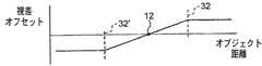 図2Bは、本発明に適合するアプリケーションで使用できる非線系の距離−マッピング曲線を示す。図示のように、シーン中のオブジェクトに適用される視差オフセット量は、収束点12ではゼロであり、ある閾値距離32まではリニアに増加する。閾値距離を越えると適用される視差オフセットの量は一定に保たれる。閾値距離32は、任意の距離に選択することができる。第2の閾値距離32’を、収束点12に対して、より視点に近い距離に実装することもできる。  FIG. 2B shows a non-linear distance-mapping curve that can be used in an application consistent with the present invention. As shown in the figure, the parallax offset amount applied to the object in the scene is zero at the