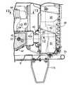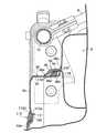 また上記バッテリ61は,ゴムバンド62により端板37に保持される。その際,バッテリ61の周囲には,空気取り入れルーバ38から第2接続口40への空気の流れを妨げないための充分な通風間隙が設けられる。このバッテリ61の点検のため,吸気ボックス34の前壁に,リッド63で閉鎖可能の点検窓64が設けられている。 The