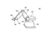 図9及び図10は、従来の移送用ロボットを示す図でり、それぞれ垂直多関節型及び水平多関節型のロボットを示す。垂直多関節型ロボット200は、床面に接地される土台201と、土台201にリンク機構(図示せず)を介して取り付けられた支持部202と、支持部202にリンク機構203により垂直方向に回転可動に取り付けられた第1アーム204と、第1アーム204にリンク機構205により垂直方向に回転可動に取り付けられた第2アームと、第2アームにリンク機構207により垂直方向に回転可動に取り付けられた保持部208と、保持部208に取り付けられたピン209とを有する。リンク機構203、205、207が回転することで、第1アーム204、第2アーム206及び保持部208が垂直方向に移動する。また、土台201と支持部202との間に設けられたリンク機構により、支持部202が水平方向に回転する。  FIG. 9 and FIG. 10 are diagrams showing a conventional transfer robot, which respectively show a vertical articulated type and a horizontal articulated type robot. The vertical articulated