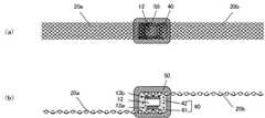 ICチップはその外部電極がスリットを跨いだ所定の位置に異方導電性接着剤40を介して接続されている。さらに第1のアンテナは第2のアンテナとなる2枚の金網20a及び20bに異方導電性接着剤を介して接続されている。図3(b)は図3(a)を断面方向から見た図である。ICチップの一方の面内に形成された2つの外部電極11a及び11bが第1のアンテナ30に異方導電性接着剤に含有される導電粒子41を介して電気的に接続され、両電極間はマトリクス樹脂42によって固定されるとともに、電気的に絶縁性を保たれている。図3(b)で第1のアンテナはアンテナとなる導体32と導体を支持するベース基材33とから形成されているが、ベース基材は無くてもよい。第1のアンテナの両端は第2のアンテナ(金網)20a及び20bに各々導電性接着剤を介して接続されている。  The IC chip has an external electrode connected to a predetermined position across the slit via an anisotropic
