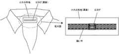 次に、上記のICタグのうちの1個を図12に示すように、タオルの折り返し部の内側に縫い付けた。また、もう1個を図13に示すように、小片の布地に縫い付け、さらにその布地をICタグが内側になるように衣服裏面の襟下部に縫い付けた。これらのタオル及び衣服を使用する際にICタグによって使い心地が損なわれることは無かった。 Next, as shown in FIG. 12, one of the above IC tags was sewn inside the folded portion of the towel. As shown in FIG. 13, the other piece was sewn to a small piece of fabric, and the fabric was further sewn to the lower part of the collar on the back of the garment so that the IC tag was inside. When these towels and clothes were used, the comfort of use was not impaired by the IC tag.