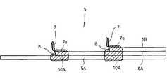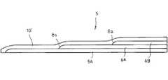また、上記のように積層される本体シート5A、及び補強シート6A,6Bは、先端に移行するに連れて、横幅が次第に狭くなるように構成することが好ましい。このように長さ方向に沿って幅が変化する構成においても、基端側の剛性が次第に高まって、先端側よりも曲がり難い構成にすることが可能となる。  Moreover, it is preferable that the main body sheet 5A and the