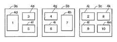 ところで、上述では、主に、集約原稿画像4(図3、4に示す例えば集約原稿画像4a〜4c)を1枚の用紙画像3に対して集約する場合について説明したが、複数枚の用紙画像3に亘って集約できる、すなわち、例えば10枚の原稿があったとして、図11に示すように、これらの原稿画像つまり10個の集約原稿画像4d〜4m(番号1番〜10番とする)を、複数枚例えば3枚の用紙画像3a〜3cにそれぞれ所定個数に分けて集約できるように構成してもよい。  In the above description, the case where the aggregated document image 4 (for example, the aggregated