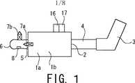 図1を参照すると、筐体1aは保持チャンバ1を画定し、保持チャンバ1は入口2を含んで、液体または乾燥粉末の薬剤は入口2を介して、たとえばマルチドーズ吸入器(MDI)3などの飛沫または粒子の源から保持チャンバに入る。MDI3は、空気が薬剤を含むように、液体状または粉末状の薬剤を雲として放出する。センサ4がMDI3と保持チャンバ1の間に配置され、MDI3の各動作を検出する。また、センサ4は空気または他のガスが入口2を介して保持チャンバ1に入るレートも検出する。