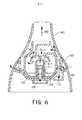 再び図6を参照すると、圧力のかかった空気は基部104の排気口108を通過して、管状ポスト111を介して噴霧器ノズル112に伝えられ、空気は噴霧器ノズル112から、圧力をかけられて噴出する。ノズル112から噴出する圧縮空気の経路にデフレクタ113があるので、圧縮空気は横にそれて、バッフル114の下を通過する。圧縮空気の通路は管状ポスト111の上を横切るので、薬剤115は、管状ポスト111の外面と、管状ポスト111を囲むスリーブ116の内面の間で吸い上げられる。薬剤115は空気の流れの中で霧状になり、バッフル114の縁の下の空気の流れで運ばれ、マウスピース101を介して上昇して患者に入る。