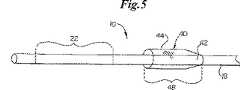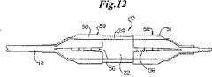 スリーブ12,14を変化させるために、これらのスリーブは、直接又は間接的に熱源即ち要素34に接することにより、変化温度まで加熱される。これに代えて、スリーブは、機械的、化学的、光学的或いは加熱以外の他の手段により誘発されて、変化状態に達する。例えば、要素34は、電気抵抗ワイヤ及び/又は導電性ワイヤ、IR放射線伝達光ファイバ(IR  radiation  transmitting  fiber  optic  line)や他の変化媒体であってもよい。要素34は、超音波エネルギーを付与する装置、食塩溶液のボーラス注入を行ったり、所望の温度やpHを有する他の物質を供給するためのルーメンを備えてもよい。実施例において、カテーテル10は、ルーメン32を有してもよく、同ルーメン内で要素34が基端方向にカテーテルへ挿入され(又は、ボーラスの場合は注入され)、スリーブ12,14の基端側に達するまで進められる。ステント24が自己拡張型の場合、要素34は、ステント24を図1に示すような収縮した状態から、図2に示す拡張した状態まで拡張させるために使用されてもよい。スリーブ12,14がpHに反応する場合、所望のpH値を有する食塩溶液のボーラスを使用して変化させてもよい。これらの実施例において、ルーメン32は、スリーブ12,14に直接ボーラスを注入するために1つ以上のポート36を有してもよい。  In order to change the