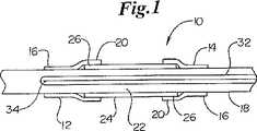 上記実施例において、各スリーブ12,14の部分16は、カテーテルシャフト18に係合される。係合された部分16は、その間に接着剤を塗布したり、摩擦係合、化学作用や加熱や他の方法による接合、或いはレーザ溶接等の溶接により、カテーテルシャフト18に係合されてもよい。各スリーブ12,14の第2部分20は、カテーテルシャフト18の所定領域22の少なくとも一部に延びる。実施例において、所定領域22は、その周囲に配置された医療装置24に離脱可能に係合するように構成される。医療装置24は、通常、ステント、グラフト、ステントグラフト、大静脈フィルタ、他の植え込み可能な医療装置であり、以下ステントと総称される。  In the above embodiment, the