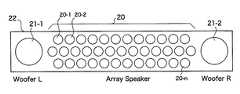 この図に示すように、スピーカの筐体22の中央部には、n個のスピーカユニットを有するアレースピーカ20が配置されており、その向かって左側にウーハ21−1が、右側にウーハ21−2が設けられている。