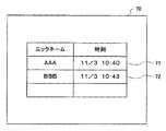 ステップS56においては、接続要求を送信してきたゲーム装置に関する情報が通常の態様で表示される。図13は、通常表示が行われる場合における表示部3cの画面70の表示例を示す図である。図13に示すように、登録を要求する接続要求をアクセスポイント装置1が受信した場合、当該接続要求を送信したゲーム装置のユーザ名情報と当該接続要求を受信した日時とを対応付けた表が画面70に表示される。なお、接続要求にはユーザ名情報が含まれているので(図12参照)、アクセスポイント装置1は、接続要求を送信したゲーム装置のユーザ名情報を当該接続要求から得ることができる。なお、例えばMACアドレスを画面に表示するようにしてもよいが、自分のゲーム装置か他人のゲーム装置かをMACアドレスから判断することはユーザにとって困難である。これに対して、ユーザ名情報が表示されることによって、ユーザは自分のゲーム装置か他人のゲーム装置であるかをユーザ名情報で判断することができるので、自機がアクセスポイント装置1に接続されているか否かを容易に認識することができる。 In step S56, information related to the game device that has transmitted the connection request is displayed in a normal manner. FIG. 13 is a diagram illustrating a display example of the
