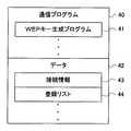 通信プログラム40は、アクセスポイント装置1が通信処理を行うためのプログラムである。通信プログラム40には、WEPキー生成プログラム41が含まれる。WEPキー生成プログラム41は、所定の乱数値から所定のアルゴリズムに従ってWEPキーを生成するためのプログラムである。ここでは、アクセスポイント装置1がWEPキー生成プログラム41を実行することによって、20バイトの乱数値から104ビットのWEPキーが生成される。なお、図示していないが、通信プログラム40には、WEPキー生成プログラム41の他、種々の通信処理を実行するためのプログラムが含まれる。なお、本実施形態では、WEPキーを生成する機能は、アクセスポイント装置1がWEPキー生成プログラム41を実行することによって実現されるとしたが、他の実施形態では、専用の回路によって実現されてもよい。 The