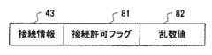 図15は、接続応答のデータの内容を示す図である。図15に示すように、接続応答には、上述の接続情報43、接続許可フラグ81、および乱数値82が含まれる。接続情報43は、アクセスポイント装置1の記憶手段(記憶部3bまたはメモリ4c)から読み出されて接続要求の一部として送信される。 FIG. 15 is a diagram illustrating the contents of connection response data. As shown in FIG. 15, the connection response includes the