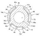 また、同様に、凹面状の反射部46aによる1回の反射ないしは複数回の反射の繰返しにより、円筒部10の円柱の長手方向に対して側視方向の光軸を略中心とした所定の視野角度、つまり円筒部10の前方側からこの円筒部10の後方側までをカバーする側視照明光を出射することができる。そして、2箇所に設けたライトガイド44及び反射部46aを設けた導光溝45又は反射部材46により、例えば円筒部10の側面の下方側部分を除いて側面方向の全周に近い広範囲に側視照明光を出射することができるようにしている。In this case, as described above, the side-view illumination light is spread over a wider range than the circumferential range in which the side-