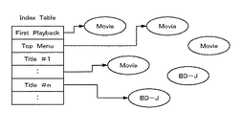 ムービープレイリスト(以下、プレイリストと略称する)は、ムービーオブジェクト(MovieObject)内のナビゲーションコマンドにより指定され、再生が行われる。ムービーオブジェクトは、タイトルの入口としてインデックステーブルに列挙される。インデックステーブルは、ディスクをプレーヤに装填した際に最初に読み込まれるデータであって、ユーザは、ディスク装填時には、インデックステーブルに記述されたタイトルが見えることになる。 A movie play list (hereinafter abbreviated as a play list) is designated by a navigation command in a movie object (MovieObject) and is played back. Movie objects are listed in the index table as title entries. The index table is data that is read first when a disc is loaded into the player. When the disc is loaded, the user can see the title described in the index table.