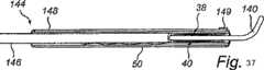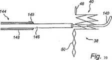 図37〜39を参照して、切断用具の解放を概略説明する。従って、今やガイドワイヤ140を設置して、図37で説明されるように、第1の切断用具30の挿入に類似する方法で、LIPV開口部に伸びるガイドカテーテル及び配送カテーテルを用いて、第2の切断用具38を所望の位置に挿入してもよい。配送カテーテル144はガイドワイヤ導管を提供する内側部146を有する。第2の切断用具38の管状部40は、配送カテーテル144の内側部146がその前で管状部40を押すように内側部146の前に配置される。配送カテーテル144は、切断用具を覆い、それを縮小した一時的状態に保持する外側の抑止部148をさらに備える。抑止部148は内側部146との関係で、軸方向に置き換え可能であってもよい。従って、切断用具38を解放するために抑止部は引っ込められてもよい。配送カテーテル144は、蛍光透視法で可視的なX線マーカーと同様に、患者の外側のカテーテルでマーカーを有し、第2の切断用具38の切断アーム50の方向性を安全に示す。第2の切断用具38は今や、切断アーム50が伸びて、前に挿入された第1の切断用具に接触し、それによって保持されるような方法で形状を変化させる位置に回転される。第2の切断用具38は、第2の切断用具38の心房端部48が依然としてLIPV開口部の外側にある位置に進められる。第2の切断用具38の正確な位置が蛍光透視法及び/又は超音波で確認されると、PVの内部から遠い配送カテーテルから第2の切断用具38の遠位端部が解放され、それによって第2の切断用具38の位置に合うように遠位端部が放射状に拡張する。次に、図38に説明されるように、第2の切断用具38の中間部及び心房端部48が解放される。今や、図39に説明されるように、切断アーム50が解放され、管状部40からの放射性伸長を担ってもよく、それによってそれが心臓壁に貫入して第1の切断用具30に接触する。  With reference to FIGS. 37 to 39, the release of the cutting tool will be outlined. Thus, a
