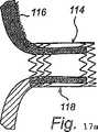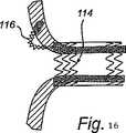 図15〜17を参照して、切断アームの作用をさらに詳細に説明する。図15では、切断アーム116を備える切断用具114が、心臓の入口の開口部で血管に挿入されている。切断用具114は、血管に挿入される管状部118を備える。切断アーム116は、管状部118に取り付けられ、心臓の中に伸びる。図15では、切断用具114は、切断用具114の挿入中にそれが有する中間体形状で示される。切断用具114は、カテーテル113a上の描かれた位置に達しているが、抑止鞘113bによって抑止されている。切断用具114は、切断アーム116が依然として抑止鞘113bによって抑止されながら、管状部118が解放された場合を示されている。従って、形状の変化は未だ完全には開始されていない。図16では、切断用具114は、形状を変化させる作用の最中を示されている。従って、切断アーム116は、形状変化の間、心臓の内部から貫入された心臓組織を有する心臓壁組織の中に伸びている。切断アーム116は、切断用具114の永続的形状を得るために心臓組織に貫入し続ける。図17aでは、形状の変化を完了した後の切断用具114が示されている。管状部118が今や血管壁を切り開き、血管の周りの心臓組織に貫入した。さらに、切断アーム116は、今や完全に心臓の外側にある。従って、切断アーム116は今や心臓壁全体に貫入しているので、血管壁の開口部から選択された隣接する心臓壁を通って切断ラインに沿って傷害を起こしている。貫入された組織は、図17b〜dと同様に図17aにて陰影で印を付ける。図17bでは、別の血管に挿入された別の切断用具120に当接している、切断用具114の切断アーム116が示されている。このように、切断アーム116は2つの切断用具の間に傷害を作り、それによって望ましくない電気信号の伝播に対して効果的な遮断が創出される。切断アーム116の位置もまた、他の切断用具120上で静止している切断アーム116によって形状の変化の後、安定化される。図17cでは、LSPVに挿入された切断用具114が示され、切断アーム116は、LAAの開口部にもたれかかって伸びており、それによって、LAAとLSPVの間の心房壁に貫入する。切断アーム116の切断に加えて、血管の内部に挿入された切断用具114の管状部118は、異所性部位を含有することが多い、開口部に隣接する血管壁を処理している。図17dでは、血管の開口部の周りの組織に貫入している心房端部121を備える切断用具114が示される。  The operation of the cutting arm will be described in more detail with reference to FIGS. In FIG. 15, a
