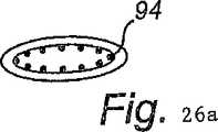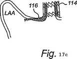 図26〜28では、LAA及びRAAに挿入される第6の切断用具94が示される。断面にて図26a〜bに示されるように、第6の切断用具94は心耳(図26a)の開口部で挿入され、この位置で拡張し、心臓壁を通って貫入する(図26b)。第6の切断用具94は、心耳の形状に合うように楕円状の断面を有する。図27では、LAA及びRAAに挿入される第6の切断用具94が示される。LSPVに伸びる切断アーム124を有するLAAに挿入される第6の切断用具94が示され、側面の右心房壁に沿って伸びる切断アームを有するRAAの中に挿入される第6の切断用具94が示される。図28では、LAAに挿入される第6の切断用具94が示される。この第6の切断用具94は切断アームを有さず、代わりに、LAAに伸びる切断アーム80を有する、LSPVに挿入される第4の切断用具が示される。LAAに挿入される第6の切断用具94は、LAA開口部にてその管状部94の端部を覆う被膜又は膜98を有する。この被膜又は膜98は、心臓の残りの部分との血液の接触からLAAを除外し、それによってLAAから、たとえば、脳への血栓又は凝血塊形成の移動を抑止する。  In FIGS. 26-28, a