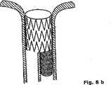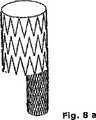 本発明の別の実施態様では、図8によれば、管状部は、左心房に最も近い第1の部分が直径で、肺静脈系のさらに小さな枝に合うように想定された第2のさらに深い部分よりもかなり大きい、互いに軸方向に接続された2つの区分を備えてもよい。従って、この実施態様は、股の付け根で一方の脚部を切ったズボンのように見える。この実施態様では、さらに深く、さらに小さな静脈におけるさらに小さな区分が肺静脈の心門に最も近いさらに大きな部分に対して優れた支持を与え、図8bに従って、この部分が左心房に移動するのを制止する。この実施態様は当然、図8cによれば、心房端部48及び切断アーム50も備える。管状部は、少なくとも2つの軸方向に分離した管状部分を備えてもよく、それらは、接続部材によって相互に接続される。これらの管状部分は、次いで、形状を変化させて異なった直径に拡張する、又は異なった程度に横に拡張可能になるように構造化され、配置されてもよい。上述の漏斗形状として同一の目的でこれを使用してもよい。従って、管状部分の少なくとも1つを、形状を変化させて、それが配置される血管の直径に相当するように直径を拡張するように構造化し、配置してもよい。このように、この管状部分は、その場で用具を保持するのに役立つ。次いで、もう1つの管状部分は形状を変化させて、治療目的で心臓組織に貫入してもよく、さらに、接続部材は、管状部分を接続する1以上の棒又はワイヤであってもよい。  In another embodiment of the present invention, according to FIG. 8, the tubular portion has a second further portion envisaged to fit the smaller branch of the pulmonary venous system, with the first portion closest to the left atrium being diameter. There may be provided two sections axially connected to each other which are much larger than the deep part. Thus, this embodiment looks like pants with one leg cut at the base of the crotch. In this embodiment, a deeper, smaller section in a smaller vein gives good support for the larger part closest to the pulmonary vein ostium, and this part moves to the left atrium according to FIG. 8b. Stop. This embodiment naturally also comprises an