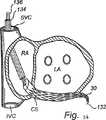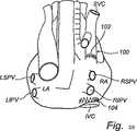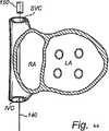 図24〜25では、それぞれCS、PV、並びにIVC及びSVCに挿入される、本発明に係る切断用具が示される。切断用具は、図18で示される状態に相当する中間体状態で示される。図24及び図25は双方ともPV間、及びCSにおける第1の切断用具30を過ぎたLIPVから僧帽弁に伸びる切断アームを説明する。従って、CSに挿入される第1の切断用具30は、切断用具の形状の変化が完了した後、切断アームの位置を安定化するためにPVから伸びる切断アームに対する支持を提供する。CSに挿入される第1の切断用具30は、少なくとも部分的に、第1の切断用具30が僧帽弁に近い組織に貫入するのを可能にする楕円状の断面を有する。また、IVCからCSの開口部まで伸びる切断アーム122がある。図24では、SVCとIVCの間の接続している切断アーム110が示され、この接続している切断アーム110は図25では存在しない。図24及び図25で示される切断パターンは、心拍調節系に対する障害に罹っているほとんどの患者に対して心臓組織における望ましくない電気信号の伝播を効果的に遮断する切断パターンを説明している。従って、切断用具を挿入してこれらの切断パターンを創出することが、心拍調節系に対する障害に罹っているほとんどの患者を効果的に治療してもよい。しかしながら、これらの切断パターンは、図26〜28に示されるように心耳の治療を説明していない。図24及び図25の切断パターンが心耳のこの治療によって補完されてもよいことが十分に理解されるべきである。  24-25, the cutting tool according to the present invention is shown inserted into CS, PV, and IVC and SVC, respectively. The cutting tool is shown in an intermediate state corresponding to the state shown in FIG. FIGS. 24 and 25 both illustrate the cutting arm extending from the LIPV past the