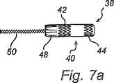図7a〜7bを参照して、LIPVに挿入されるように適応させた第2の切断用具38が示される。図7aでは、第2の切断用具38は、縮小された一時的形状で説明され、図7bでは、第2の切断用具38は拡張状態で説明される。この第2の切断用具38は、LIPVの開口部で心臓に挿入されるように適応させられる。第2の切断用具38は管状部40を有する。図7a〜7bに示すように、管状部40は2以上の部分を含んでもよい。LIPVの開口部に最も近く挿入される管状部40の第1の部分42は、形状を変化させてLIPV壁を円周方向に貫入し、LIPVの周りで心臓壁組織に貫入するように配置される。従って、望ましくない電気信号の伝播に対する効果的な遮断が、LIPVの開口部周囲で形成される。管状部40の第2の部分44は、形状を変化させて血管壁に当接するか又は、血管壁に貫入だけするように配置される。従って、この第2の部分44は、軸方向における第2の切断用具38を安定化するように役立つだけであり、必要とされなくてもよい。管状部40の第1の部分42と第2の部分44は、棒又はワイヤの形態で、接続部剤46によって相互接続される。第1の部分42は、LIPVの開口部に最も近い端部でさらに大きな直径を有する漏斗形状であってもよい。漏斗形状は、開口部に向かって大きくなるLIPVの直径を補う。しかしながら、漏斗形状の第1の部分42の直径は開口部に向かうLIPVよりもさらに大きい程度に大きくなってもよく、それによって、第2の切断用具38が開口部端部にて心臓組織にさらに深く貫入する。さらに、漏斗形状の第1の部分42の小さいほうの端部は、軸方向で第2の切断用具38を安定化するために血管壁に単に貫入するか、又は当接するように配置されてもよい。管状部40の第1の部分42は、心臓内部のLIPVの開口部から心臓壁外側の位置まで伸び、それによって、漏斗形状の第1の部分の小さいほうの端部が心臓壁の外側に配置される。従って、漏斗形状の第1の部分の小さいほうの端部が血管壁に単に貫入するか又は当接しているとしても、第1の部分42は心臓壁の全体の厚みにわたって心臓組織に依然として貫入してもよい。  With reference to FIGS. 7a-7b, a