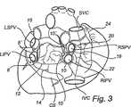 しかしながら、図2から明らかなように、切断パターンは、広範囲にわたり、且つ複雑であり、難しい手術を必要とする。従って、メイズパターンは、必要とされる切断を最少限にして、パターンをできるだけ簡略化するために進化させられてきた。現在、図3に示すように、メイズIIIパターンが使用されている。このパターンはさほど複雑ではないが、ほとんどの症例で異所性部位を依然として効果的に隔離する。メイズIIIパターンは、左上肺静脈(LSPV)と左下肺静脈(LIPV)の周りに切断8、及び右上肺静脈(RSPV)と右下肺静脈(RIPV)の周りに相当する切断10;肺静脈(PV)の周りの2つの切断8と10を接続する切断12;この接続切断から冠状静脈洞(CS)までの切断14;左PVから左心耳までの切断16;下大静脈(IVC)から上大静脈(SVC)までの切断18;右PVの周りの切断10とIVCとSVCの間の切断18を接続する切断20;右側面心房壁に沿ったIVCとSVCの間の切断18からの切断22;及び右心耳を隔離する切断24を含む。従って、あまり複雑ではなく、効果的に異所性部位を隔離するパターンが確立されている。場合によっては、切断すべてを必要とするわけではない。たとえば、異所性部位の発生はPVの開口部の周りで始まることが多いので、PVの周りの切断8、10を作ることで十分であるかもしれない。さらに、線8’及び10’で示すように、PVの周りの切断は、ペアを組む代わりに、各PV開口部に沿って行ってもよい。  However, as is apparent from FIG. 2, the cutting pattern is extensive and complex, requiring difficult surgery. Thus, maize patterns have been evolved to minimize the required cuts and simplify the patterns as much as possible. Currently, the maize III pattern is used, as shown in FIG. This pattern is less complex but still effectively isolates ectopic sites in most cases. The maize III pattern consists of a cut 8 around the left upper pulmonary vein (LSPV) and left lower pulmonary vein (LIPV), and a