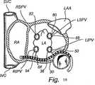 図19には、図18で示された切断用具が用具の形状の変化を生じた後が示される。今や、第2、第3、第4及び第5の切断用具38、54、68、82は、それぞれのPVの外に拡張し、PVの開口部の周りの処理された組織が陰影で示される。さらに、切断アームは心臓組織に貫入し、PV間、LIPVから僧帽弁に、LSPVからCSに、及びLSPVからLAA開口部に切断ラインを創出している。  FIG. 19 shows the cutting tool shown in FIG. 18 after the shape of the tool has changed. Now, the second, third, fourth and