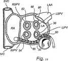 図35及び36で説明されるように、ガイドワイヤ140を診察用カテーテルの中で左心房(LA)の中に進める。LAにアクセスするために、LAと右心房(RA)との間の心房中隔が貫入されなければならない。正常には、ヒトでは胎児期にのみ存在するLAとRAとの間の開口である卵円孔開存(PFO、図35)を患者が有すれば、たとえば、バルーンカテーテル(図示略)によってこれを用いて拡大してもよい。PFOが存在しなければ(図36)、アクセス静脈の内部の診断用カテーテルを通って通過させられる長い柔軟性の針によって、小さな開口142が先ず創出される。再び、心房中隔における開口142は、バルーンによって拡大される。いったん、針がLA内部にあれば、カテーテルは針を通り過ぎてLAに進み、針は引っ込められる。ガイドワイヤ140は、今やカテーテルを介してLAに進み、さらにLIPVに進められる。  As illustrated in FIGS. 35 and 36, guidewire 140 is advanced into the left atrium (LA) in the diagnostic catheter. In order to access LA, the atrial septum between LA and the right atrium (RA) must be penetrated. Normally, if a patient has a patent foramen ovale (PFO, FIG. 35), which is an opening between LA and RA that exists only in the fetal period in humans, for example, this can be achieved by a balloon catheter (not shown). You may enlarge using. In the absence of PFO (FIG. 36), a