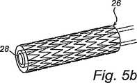 図5aに示すように、切断用具26は、一時的な形状にて血管28の所望の位置に挿入される。刺激、たとえば、体温に対する応答として、切断用具26は次いで形状を変化させ、永続的な形状を得ることに向けて努力する。切断用具26の記憶された永続的な形状は、血管28に適合しないが、それによって切断用具26は、図5bに示すような永続的な形状を得るために周囲の組織をそれ自体がかきわけて進む。このようにして、切断用具26は先ず血管壁に貫入し、その後、血管28周囲の組織に貫入する。貫入された組織の細胞は殺され、それは体内での治癒反応を開始する。切断用具26が所望の位置に置かれ、心臓壁の組織を貫いて形状を変化させた場合、電気信号を伝える細胞はこのようにして殺されてもよい。治癒過程は電気信号を伝える能力を回復させないので、切断用具26は、心臓壁を介した電気信号を伝える能力を低減する。幾つかの切断用具を理に適って配置し、切断用具26の永続的な形状を相応に設計することによって、切断用具26が心臓壁組織に貫入し、メイズIIIパターンに相当する切断のパターンを創ってもよい。  As shown in FIG. 5a, the cutting