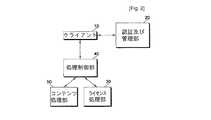 クライアント認証を認証及び管理部20に要求することによって、クライアントを認証することができる。認証されたクライアントは、所定のエンティティを呼び出すことによって所定のデータ、例えば、所定のコンテンツ又はライセンスを所望の送信先に伝送するよう処理制御部40に要求することができる。ここで、送信先を、所定のコンテンツ又はライセンスに適用されるDRMと異なるDRMがインストールされたデバイス又はソフトウェアシステム、例えば、ドメインに存在する他のクライアントデバイスとすることができる。  By requesting client authentication from the authentication and