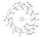図4に示すように、第1の主面25dに対し第2の主面25eは角度を有している。第1の主面25dと第2の主面25eとがつながる外周面25g及び内周面25hは例えば円弧状(曲面状)に形成されているが、平面に形成されていてもよい。第1の主面25dと第2の主面25eとがなす角度αの設定が、α>0°とすると、必然的に隣接するブレード25cの放射方向に構成されるブレード25cの開口角度βが、β<(360°/n)となる。nはブレード25cの枚数である。参考として、n=12、α=15°と設定された場合、β=15°となる。これを、n=12、α=0°、β=30°、つまり第1及び第2の主面が平行でなるブレードを有する羽根車と比較した場合、発生風量が約20%向上したことが実験で確認されている。  As shown in FIG. 4, the second