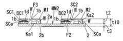 そして、ベアチップBC1とICKa1の対を覆うように、1つの面を開口したシールドケースSC1(第1のキャップ体)の開口周縁の鍔部SCaをモジュール基板2の一面2aに接着封止し、さらにベアチップBC2とICKa2の対を覆うように、1つの面を開口したシールドケースSC2(第2のキャップ体)の開口周縁の鍔部SCaをモジュール基板2の一面2aに接着封止する。  Then, the flange SCa of the opening periphery of the shield case SC1 (first cap body) having one surface opened is adhered and sealed to the one