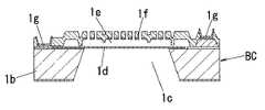 まず、マイクロホン装置MM1に用いられるマイクロホンのベアチップBCは、MEMS(Micro Electro MechanicalSystems)技術を用いてシリコンウェハー上に複数形成されたベアチップBCを個片に分離することで形成される(図2(a))。このベアチップBCは、図4に示すように、シリコン基板1bに穿設した孔1cを塞ぐようにシリコン基板1bの一面側にSi薄膜1dが形成され、このSi薄膜1dとの間にエアーギャップ1eを介して電極1fが形成され、さらに音声信号を出力するパッド1gが設けられており、シリコン基板1bの他面側(図4中の下側)を集音面とするコンデンサ型のシリコンマイクロホンを構成している。そして、外部からの音響信号がSi薄膜1dを振動させることで、Si薄膜1dと電極1fとの間の静電容量が変化して電荷量が変化し、この電荷量の変化に伴ってパッド1g,1gから音響信号に応じた電流が流れる。  First, a bare chip BC of a microphone used in the microphone device MM1 is formed by separating a plurality of bare chips BC formed on a silicon wafer into individual pieces using a MEMS (Micro Electro Mechanical Systems) technology (FIG. 2A). )). As shown in FIG. 4, in this bare chip BC, a Si