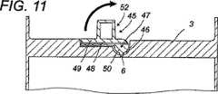このさらに他の実施形態における旋回可動要素45の胴体部は、カップの底部壁部3に形成された空隙46内を旋回する略ホイッスル形状であり、たとえば対応する対向スロット内で締められて収容される47などの2つの横断爪部により形成される。この胴体部は空気通路チャネル48により長手方向に交差して、空隙基部46の開口部6に対面するまたは近傍の開位置、つまり図面に示されるようにカップの底部壁部3の通気孔開口部に抜ける。傾斜する可動要素45の胴体部は、直線の細長い部分49および球状部分50から構成される。球状部分50の下方部分は、停止および閉鎖用ピン51に合致する。このピンはカップの底部壁部3の開口部6を、閉じた下方傾斜位置で閉じて、旋回する可動要素45をこの位置で保持するためのものである。ピン51に対応する突出部は、後者の端部が、底部の内部表面から突出しないようにするが、突出したとしてもせいぜい、これと同一平面である。この閉鎖可能な通気孔装置の旋回する可動要素45は、旋回部が図12で示される開位置で停止し、カップ排気口の閉プラグが、図13に示される要求される残りの塗装を行なうので、ブロック52を把持手段として作用する横断突出部に備える。In this further embodiment, the body portion of the swivel