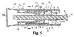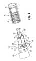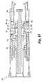 グリップ部分364の先端部は、筒状部366および368へと縮径している。これらの筒状部は、駆動部280の内側中空部に適合し、且つ、ペン使用中、そのような中空部に摺動して入出可能である。内側リップ370が、筒状部分368の先端部に形成されており、かつ4個の円周方向に間隔を隔てたバー372が、該リップから軸方向に突出しかつ途中で止まっている、頭部の切り取られたような円錐形の内面376を備えたプランジャーリング部分374を支持している。リング部分374と、リップ370と、の間の間隙は、プランジャー360の内周と、バー372の内側周りと、に凹部または溝378を区画しており、該溝378が、プランジャー360のフォロアー320との連結に使用されており、軸方向に固定されるが回転自在に動くことができるものとなっている。  The tip of the