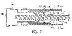 プランジャー160は、ポリカーボネートのような軽量材料から射出成形されている。一部品構造を有するものとして図示されているが、製造容易化のために、プランジャー160は、筒状メインボデーの基端部上にキャップを付けたもののような、互いに組み合わされる複数部品で形成され得る。プランジャー160は、駆動部100の先端側へと伸びるグリップ部分162を備えている。該グリップ部分は、ペンコッキング目的のためにユーザーによって手動で引かれるように外側から利用しやすいものである。その基端方向への長さに沿い、グリップ部分162は、半径方向外方へ拡開しており、図1で左へ引くときに、ユーザーの親指と他の指の間でより確実に把持されるように構成されている。他の把持しやすいグリップ部分の構造は、置き換えることができる。該構造は、指が挿入されるループ、またはその下に指を巻き付け得るバーのようなものである。プランジャー160の基端部164は、押す面として機能し、その上に力が加えられてコックされたペンを図1の右へ押すことができる。