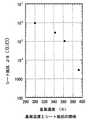 半導体層の表面に吸着するドーパントイオン量を制御するための手段としては、さらにプラズマ照射時の基板温度の制御も有効であることが、実験から見出されている。図5は基板温度(K)を変化させて膜厚70nmの非単結晶シリコン層のシート抵抗値(sの変化を測定したものである。図5において、横軸が基板温度(K)であり、縦軸がシート抵抗値(s(Ω/cm2)である。図5からも明かなように、プラズマ照射時の基板温度を高くする程、そのシート抵抗値(sが低下する傾向があり、プラズマ照射時の基板温度を高くすることで不純物拡散領域の高抵抗化を図ることができる。なお、この実験において、基板温度以外のプラズマ照射条件は、フォスフィン(PH3)と99%の水素(H2)の混合ガスを流量10sccmとし、アルゴンガスを流量50sccmで導入し、圧力を475mTorr、基板温度を130℃、RFパワーを20W、そしてプラズマ照射時間を1分に設定している。また、活性化のためのエキシマレーザーアニールの条件については、エキシマレーザーとしてXeClエキシマレーザー(波長308nm)が使用され、98%のオーバーラップ率で順じ照射したものである。