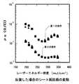 さらに図9はLIMPID法での再現性を示した図であり、アモルファスシリコン膜を被覆させ、レーザーアニ−ルを施した状態においてのシート抵抗値の変動を測定した結果を示す図である。図9中、上側の分布はフォスフィンと水素(PH3/H2)の混合ガスの流量を9sccmとし、水素ガスの流量を92sccmとし、アルゴンガスの流量を50sccmとした第1の条件下のデータであり、下側の分布はフォスフィンと水素(PH3/H2)の混合ガスの流量を9sccmとし、アルゴンガスの流量を50sccmとした第2の条件下のデータである。図9中の四角の印部分は或日に処理したときのデータであり、三角の印部分はその約6日後に再度処理したときのデータである。これら四角の印部分と三角の印部分は良く重なっており、LIMPID法では再現性に優れた素子の形成が可能であることが分かる。