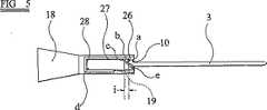 表面18は円錐面として例示されているが、本発明の範囲内において他の実施例を用いることもできる。図面において、この表面は真っ直ぐ、換言すれば実質的に円錐形、すなわち復元力を発生させるのに十分な円錐形である。しかしながら、この表面は図示のように真っ直ぐである必要はなく、より線形な復元率をもたらすために湾曲させることもできる。したがって、力Yは、スライド自在なスリーブ5の適切な動作ストロークにわたって実質的に一定にすることができる。加えて、注射針ハブ17の受け入れ端部の表面18は、その全体が円錐形である必要はない。実際、まさに1つのテーパ部分、例えばテーパ状の稜線があれば充分である。このテーパ部分は、注射針ハブ7の表面から突出していなければならないわけではない。このテーパ部分はまた、注射針ハブの壁の内部に入り込むことができる。すなわちテーパ状の稜線ではなく、テーパ状の凹部とすることができる。また、図8を参照して後述するように、スライド自在なスリーブ5が適切に構成されるならば、注射針ハブ7の表面18における突起で十分である。  Although the