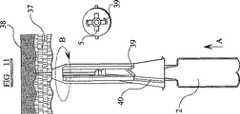 図11を参照すると、ユーザが矢印Aの方向に注射針3を押して患者の表皮37を通じて皮下組織38の内部に挿入すると、スライド自在なスリーブ5の表面が患者の表皮37の角質層と接触することになる。矢印Aの方向へのさらなる動きはスライド自在なスリーブ5を注射器2に向かって押し、したがって片持アーム9は、もちろんこの目的のために構成されている注射針ハブ7によってさらに外側へと押動される。同時に、少なくとも一つの片持アーム9の端部がカム39に対して押圧されると、カム39に押圧されている片持アーム9の端部が軌道7aを形成している溝40に落ち込むまで、スライド自在なスリーブ5および片持アーム9は矢印Bの方向に回転する。溝40は注射針に向かう傾斜を有しており、それは片持アーム5の合力を維持する。この時点において(スライド自在なスリーブ5の動き量は1〜2ミリメートルであるが)、安全注射針が患者から引き抜かれると、片持アーム9の合力はスリーブ5を前進位置へと付勢する。  Referring to FIG. 11, when the user pushes the