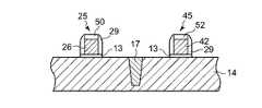 図3は、本発明の一実施形態によりPFETおよびNFETを形成するための処理における一段階を示している。図3に示されている通り、PFETゲート・スタック25およびNFETゲート・スタック45は、基板の単結晶領域の上に重なって形成される。単結晶領域14は本質的に、シリコンなどの第1の半導体材料からなる。PFETゲート・スタック25は、単結晶領域14の上に重なるゲート誘電体13と、ゲート導体層26の側壁上に形成された1対のスペーサ29と、絶縁キャップ50とを含む。NFETゲート・スタック45は、単結晶領域14の上に重なるゲート誘電体13と、ゲート導体層42の側壁上に形成された1対のスペーサ47と、同じく好ましくはテトラエチルオルトシリケート(TEOS)の前駆物質からの酸化物の付着によって形成された絶縁キャップ52とを含む。  FIG. 3 illustrates a stage in the process for forming PFETs and NFETs according to one embodiment of the present invention. As shown in FIG. 3,