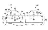 同じく図1に図示されている通り、基板の単結晶領域14にはNFET12が設けられている。NFET12は、ゲート導体の高濃度ドーピングされたn型ポリシリコン部分42の下に配置されたチャネル領域40を含み、そのゲート導体はNFET12の低抵抗部分44の下に配置されている。低抵抗部分44は、PFET10の低抵抗部分28のように、金属、シリサイド、またはその両方を含むことができ、最も好ましくはコバルトのシリサイド(CoSi2)を含む。Similarly, as shown in FIG. 1, an NFET 12 is provided in the