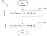 アクセス端末402は、通信リンク406上でデータパケットを受信するように構成され、データパケットのうちの1つはAccessParametersグループメッセージ410を含むことができる。AccessParametersグループメッセージ410をリンクから抽出するために、様々な方法を使用することができる。例えば、アクセス端末402は、データパケット412をリンクのチャネルのうちの1つから抽出した後、データパケット412のヘッダ情報を調べて、データパケット412がAccessParametersグループメッセージ410を含むか否かを判断することができる。含む場合、アクセス端末402は、メッセージの指定されたビットを抽出し、それらの値をメモリ(図2のメモリ272等)に記憶する。