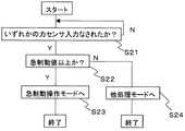 このときの制御手段4の動作を図19のフローチャートに沿って説明する。検出手段3から制御手段4に少なくとも一つの力センサ2からの検出信号が入力された場合(S41)、その入力された検出信号が予め定められた設定値以上の操作力を示した場合(S42)、アクセル操作と判断して駆動操作モードに移行する(S43)。なお、操作力の大きさの検出は、実施例1にて説明したように、力センサ2の出力電圧Voutに対応した操作力をキャリブレーションにて予め求めておけば、力センサ2に加えられた圧力を定量的に求めて操作力を算出できる。駆動操作モードの場合は、車両加速制御手段46に操作信号を送って燃料を増加させ、エンジン47を加速させる。駆動操作モードではないと判断した場合は、実施例2等で説明した他の車載設備の操作と判断して、対応する操作処理を行う(S44)。  The operation of the control means 4 at this time will be described along the flowchart of FIG. When a detection signal from at least one