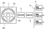 また、力センサが埋め込まれた部位の把持部の表面に、当該力センサに係る車載設備の操作内容を表示することが好ましい。さらに、検出信号に基づいて操作信号により操作する車載設備を選択して切り替える手段を設けることができる。また、操作信号を車載設備へ出力するか否かを選択する入力切替手段を設け、運転者に選択させるようにすることもできる。Moreover, it is preferableto display the operation contentof the vehicle-mounted equipment related to the force sensor on the surface of the grip portion of the site where the force sensor is embedded. Furthermore, it is possible to provide means for selecting and switching on-vehicle equipment operated by the operation signal based on the detection signal. Further, it is possible to provide an input switching means for selecting whether or not to output the operation signal to the in-vehicle facility so that the driver can select it.
