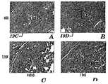 別の実施例では、精練した絹フィブロイン原繊維を細胞誘導物質で処理した(表9)。まず、精練した絹フィブロインの繊維を一緒にツイスト加工することによってヤーンを作った。一部のヤーンは、細胞を誘導するためRGDペプチドで誘導体化したフィラメントで作製した。この誘導体化はSofia et al, J. Biomed. Mater. Res. 54: 139-148, 2001に記載の手順で行った。処理済ヤーンおよび未処理(黒ブレード絹縫合糸)ヤーンの切片をラットの腹壁内に埋植した(図18A〜C)。埋植30日後、黒ブレード縫合糸はコンパクトな原繊維のバンドルを含んでおり、原繊維のバンドルの間には細胞が浸潤していたがバンドルの内部には浸潤していなかった。これとは対照的に、RGD処理した原繊維のバンドルは、宿主細胞の広範な侵入が生じ、拡張しておりコンパクトではなかったが(図13A〜E、18B)、有意な分解はまだ生じていなかった(図13A〜E)。 In another example, scoured silk fibroin fibrils were treated with cell inducers (Table 9). First, a yarn was made by twisting together scoured silk fibroin fibers. Some yarns were made with filaments derivatized with RGD peptide to induce cells. This derivatization was performed according to the procedure described in Sofia et al, J. Biomed. Mater. Res. 54: 139-148, 2001. Sections of treated and untreated (black blade silk suture) yarns were implanted in the rat abdominal wall (FIGS. 18A-C). 30 days after implantation, the black blade suture contained compact fibril bundles, with cells infiltrating between the fibril bundles but not inside the bundle. In contrast, RGD-treated fibril bundles caused extensive invasion of host cells and were not expanded and compact (Figures 13A-E, 18B), but significant degradation was still occurring. None (Figures 13A-E).