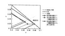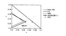 図8b、8c、8dは、それぞれ緑色(G)、青色(B)、赤色(R)の各領域を拡大した図である。なお、図8a、8b、8c、8dのxy色度図中には、Adobe  RGB規格の色再現範囲、国際照明委員会(CIE)が定めたXYZ表色系、sRGB規格の色再現範囲、主白色光源21のみを光源として使用した場合の色再現範囲も同時に示してある。  8b, 8c, and 8d are enlarged views of green (G), blue (B), and red (R) regions, respectively. In the xy chromaticity diagrams of FIGS. 8a, 8b, 8c, and 8d, the color reproduction range of the Adobe RGB standard, the XYZ color system defined by the International Lighting Commission (CIE), the color reproduction range of the sRGB standard, The color reproduction range when only the